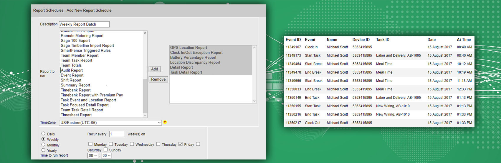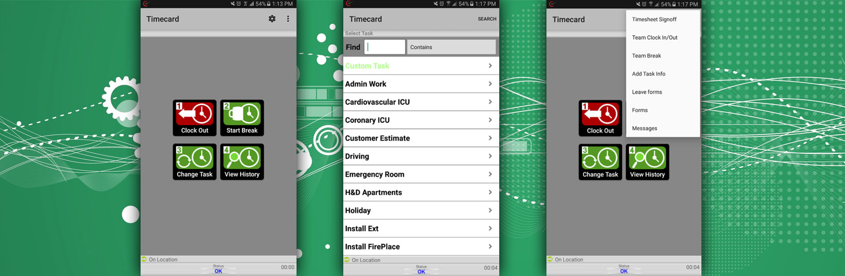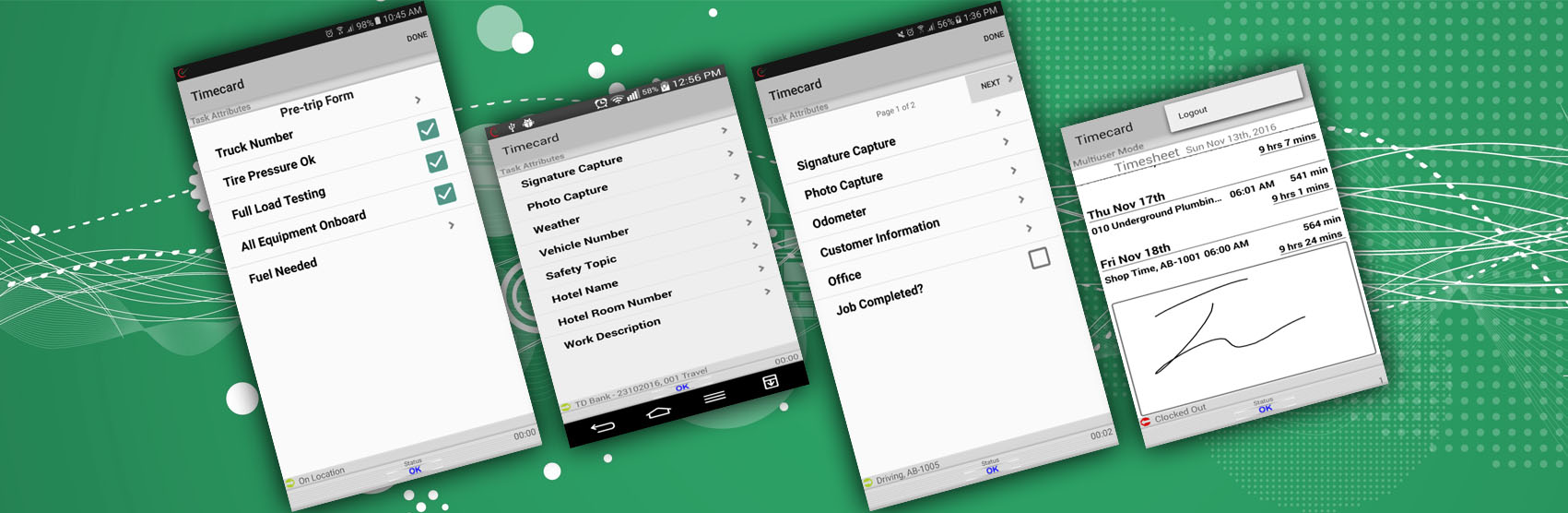 This timesheet information is collected on the mobile device along with associated GPS location data.